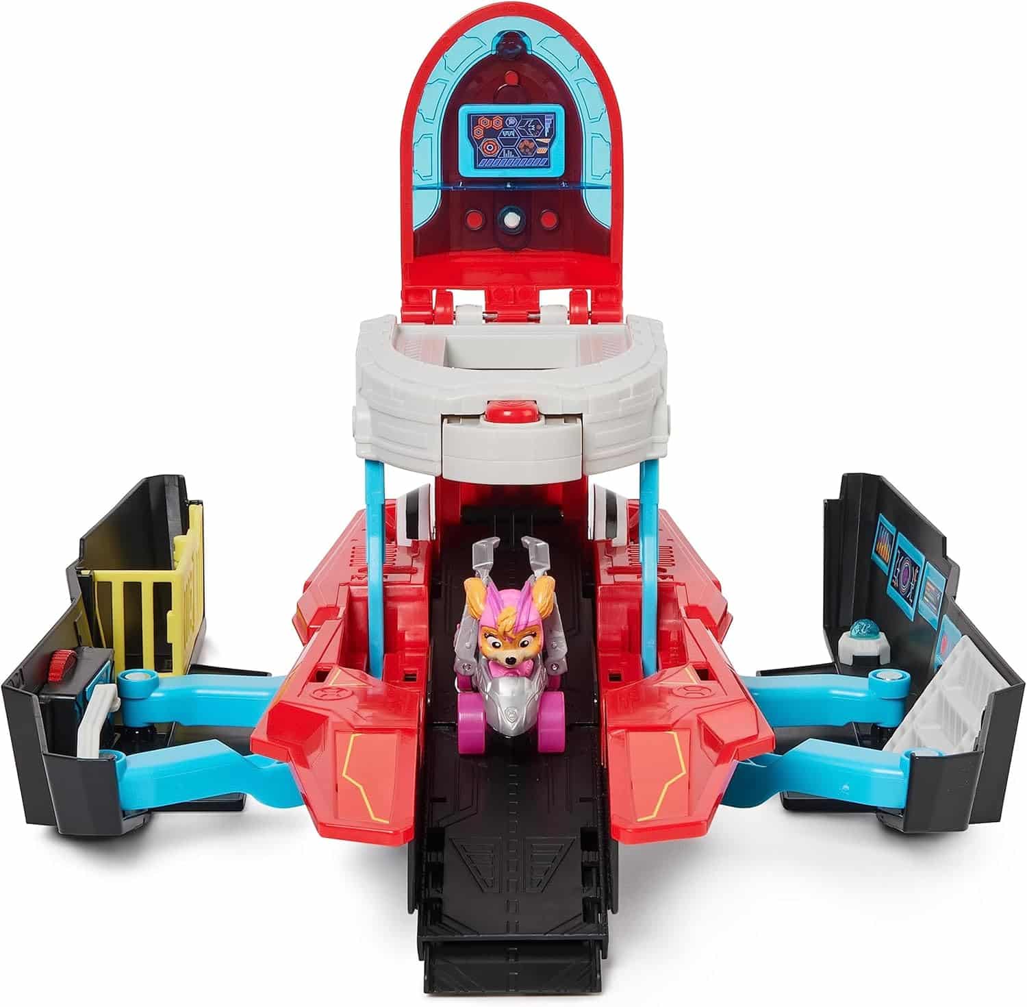 Découvrez le porte-avions Quartier Général Marine Pup Squad de la Pat’Patrouille pour participer à des missions de sauvetage palpitantes sur des mers imaginaires ! Il est accompagné d’un authentique véhicule Racer Pup Squad Stella issu de La Super Patrouille le film.