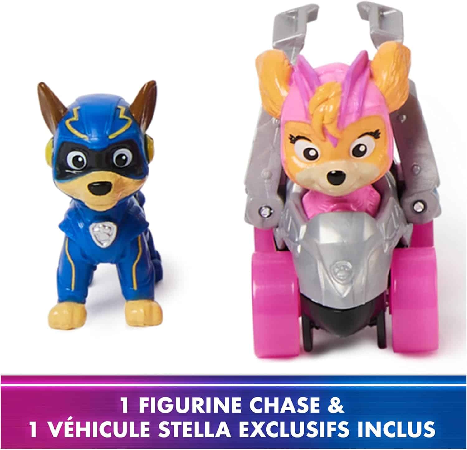 Les figurines de Stella et Chase en version Super Patrouille sont incluses dans cet ensemble. Stella est un adorable cocker qui pilote l’hélicoptère de la Pat Patrouille, tandis que Chase est un berger allemand qui conduit la voiture de police. Dans cette version Super Patrouille, les deux personnages sont équipés de tenues spéciales avec des super pouvoirs pour affronter les missions les plus périlleuses.