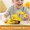 La Grue de Chantier Interactive n’est pas uniquement une grue. Elle est accompagnée d’une figurine articulée de Ruben, vêtu de son uniforme de construction, ainsi que d’un véhicule bulldozer. Ce duo dynamique permet aux enfants de recréer des scènes de la série animée et d’inventer leurs propres missions de sauvetage.